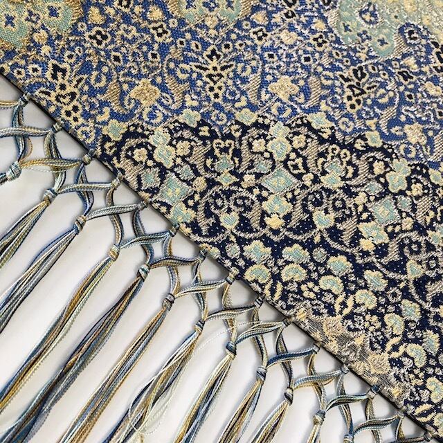 輪奈織(わなおり)とは別名、金崋山織り・モール・ビロード織りとも呼ばれ、経糸に太い糸を一串ずつ刺していき、経糸をモール状に包むようにして織り上げ、製織後に太い糸を1本ずつ引き抜いて文様が浮き立つように仕上げられる、最高難度の織り技です。