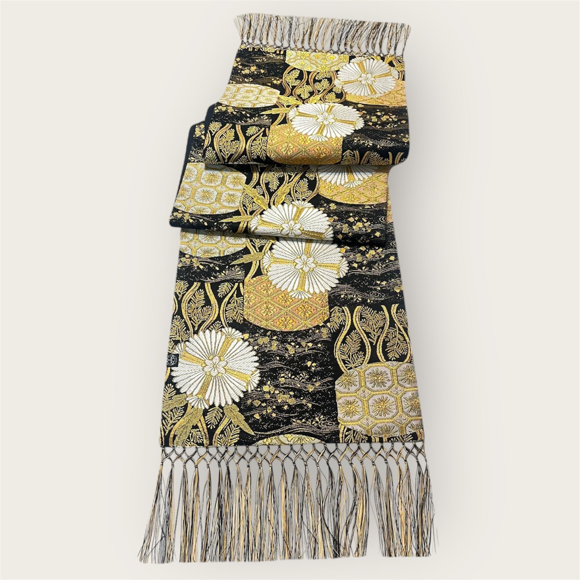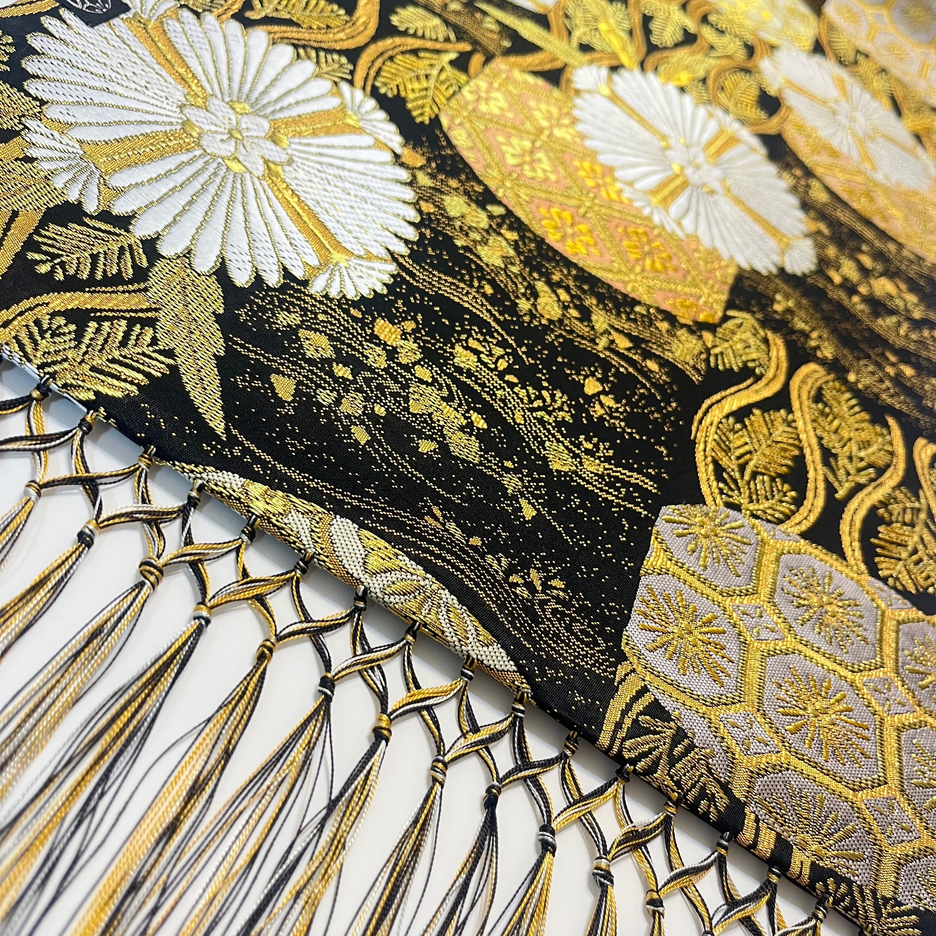 漆黒の地に浮かび上がる金と白の文様が、まるで夜空に咲く光の花のように華やぎを添える一枚。