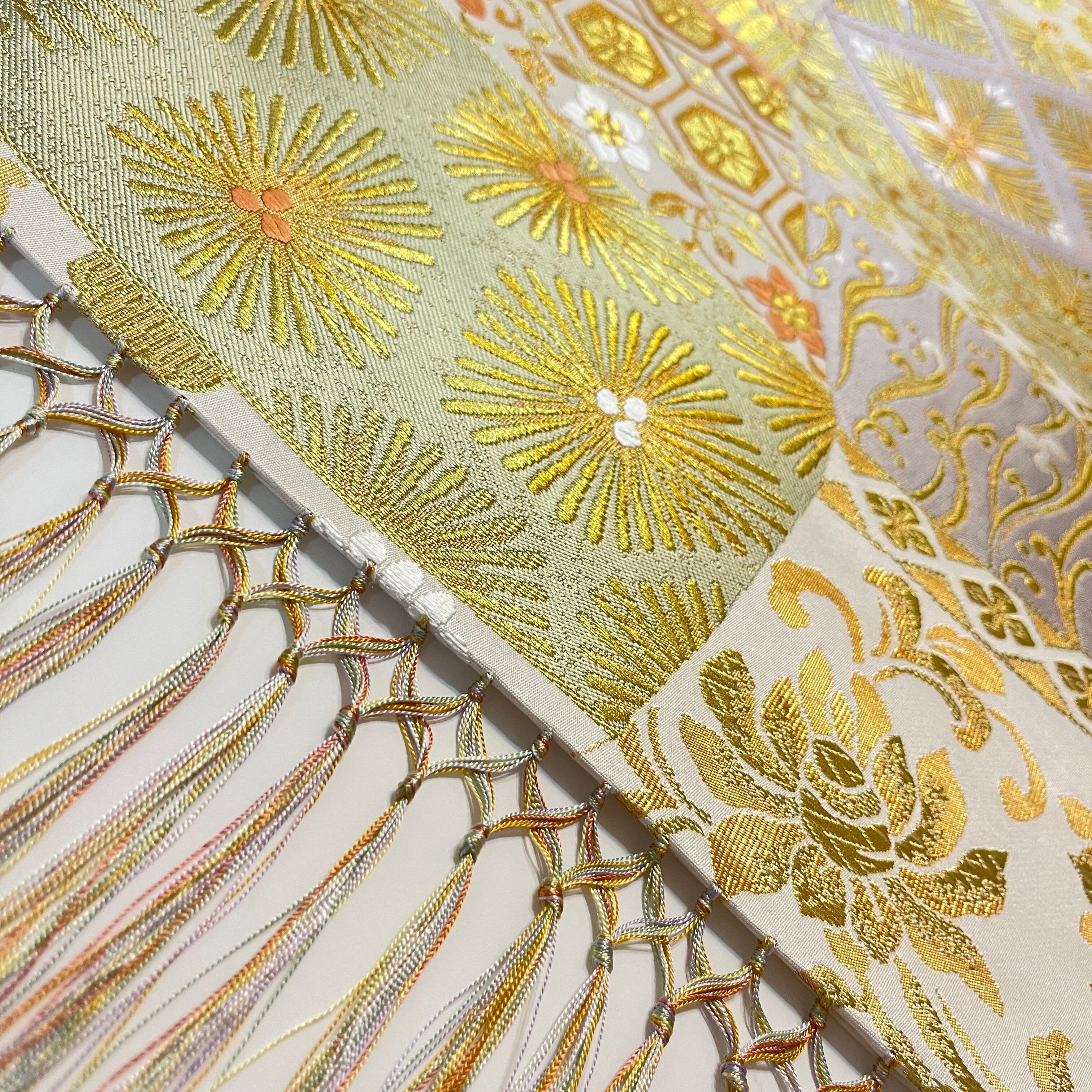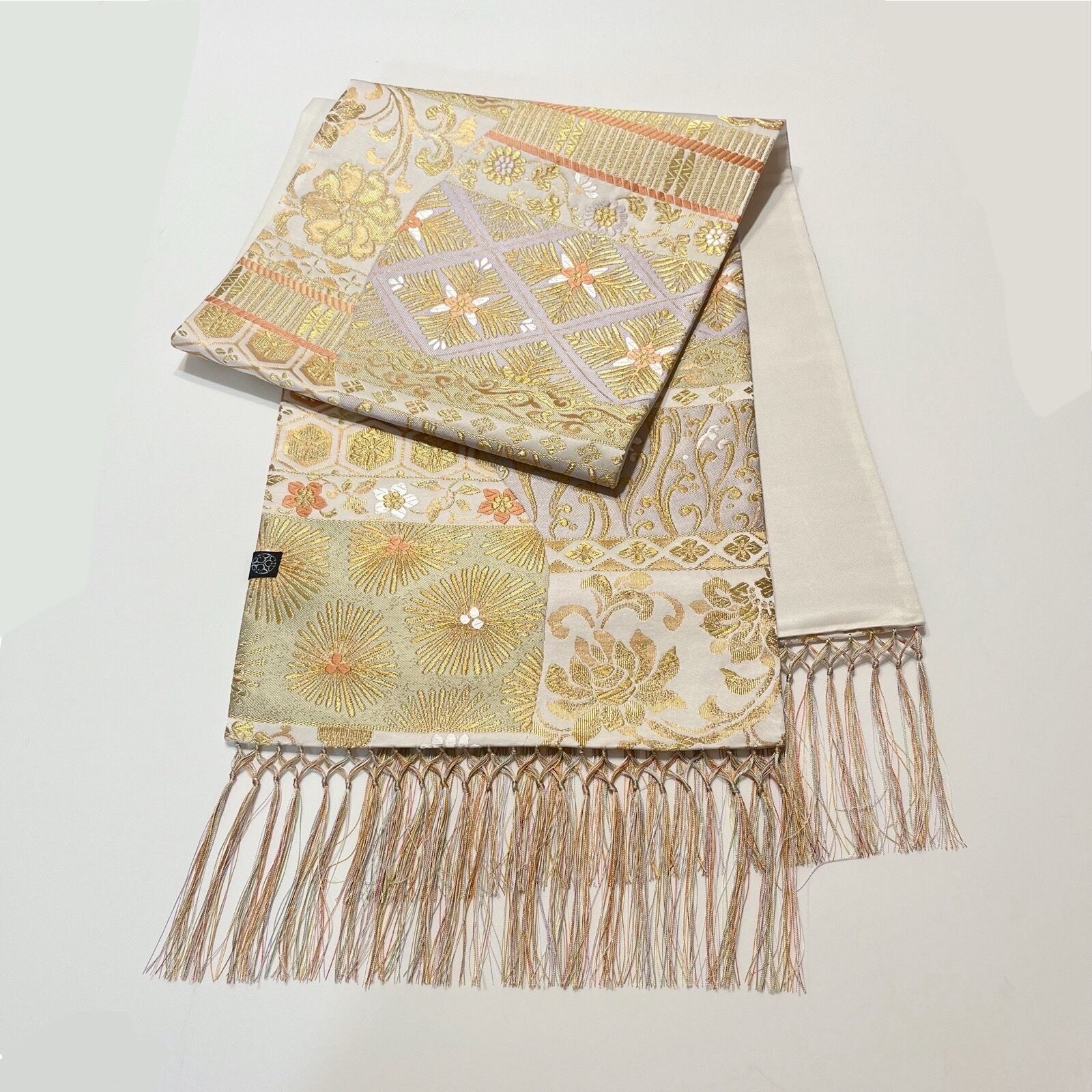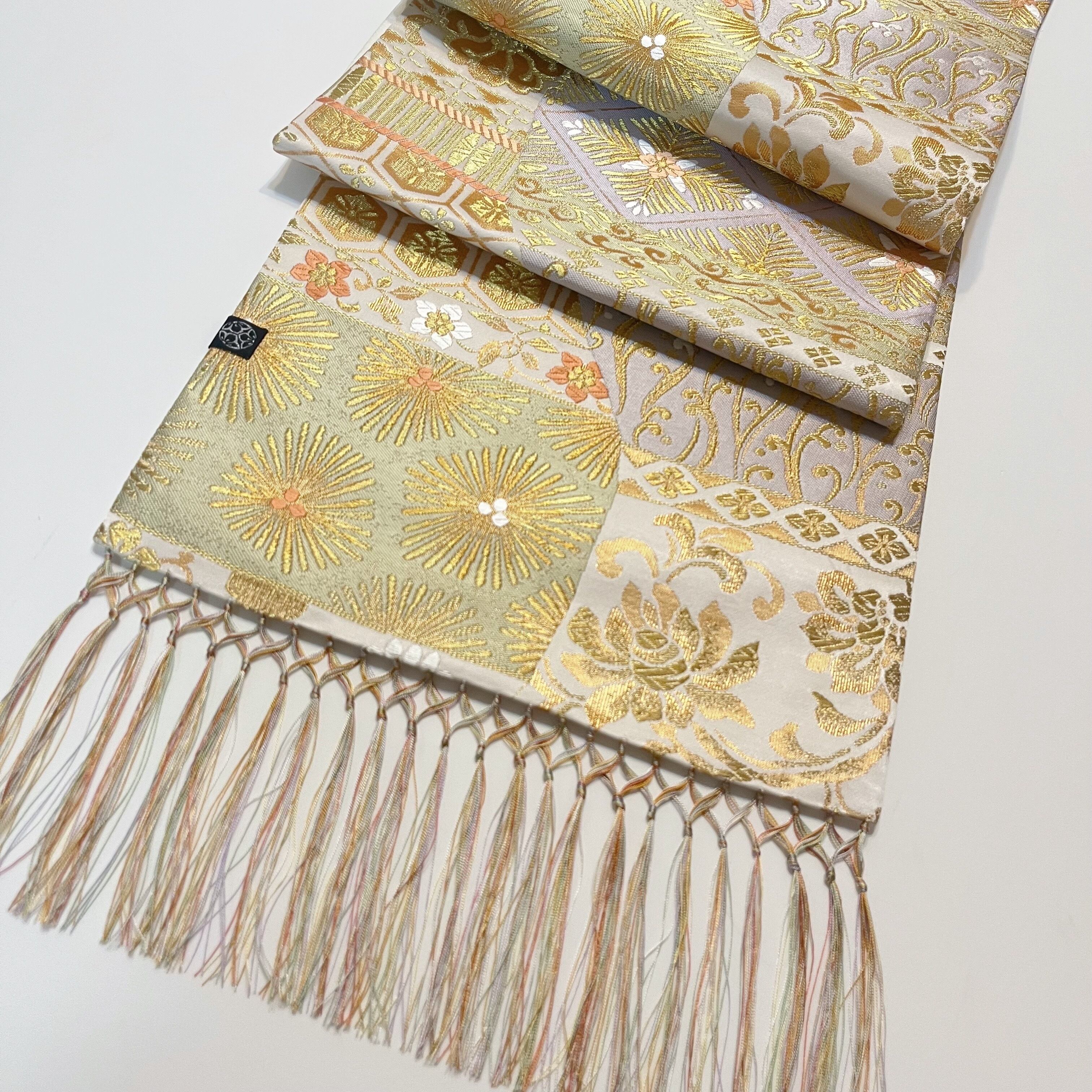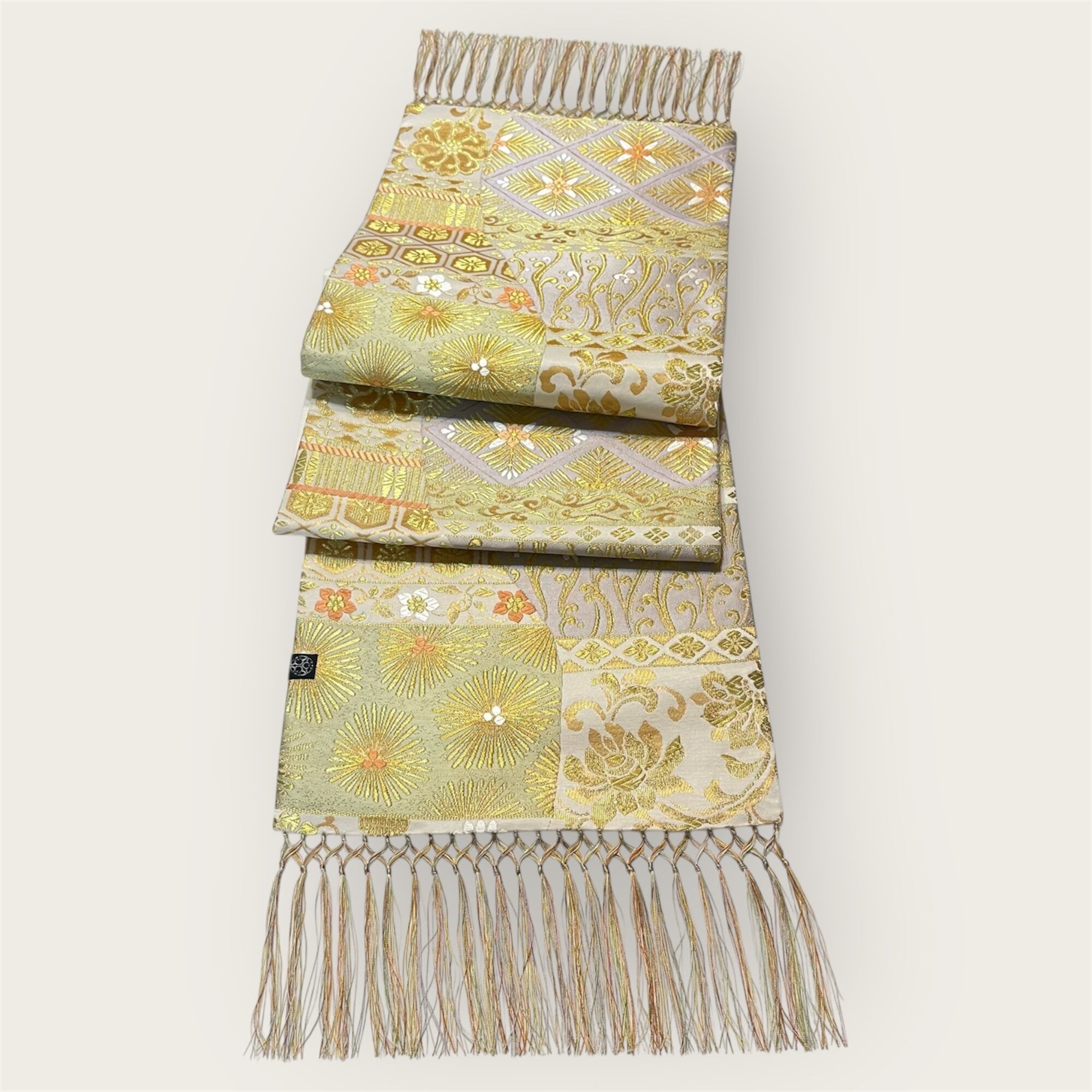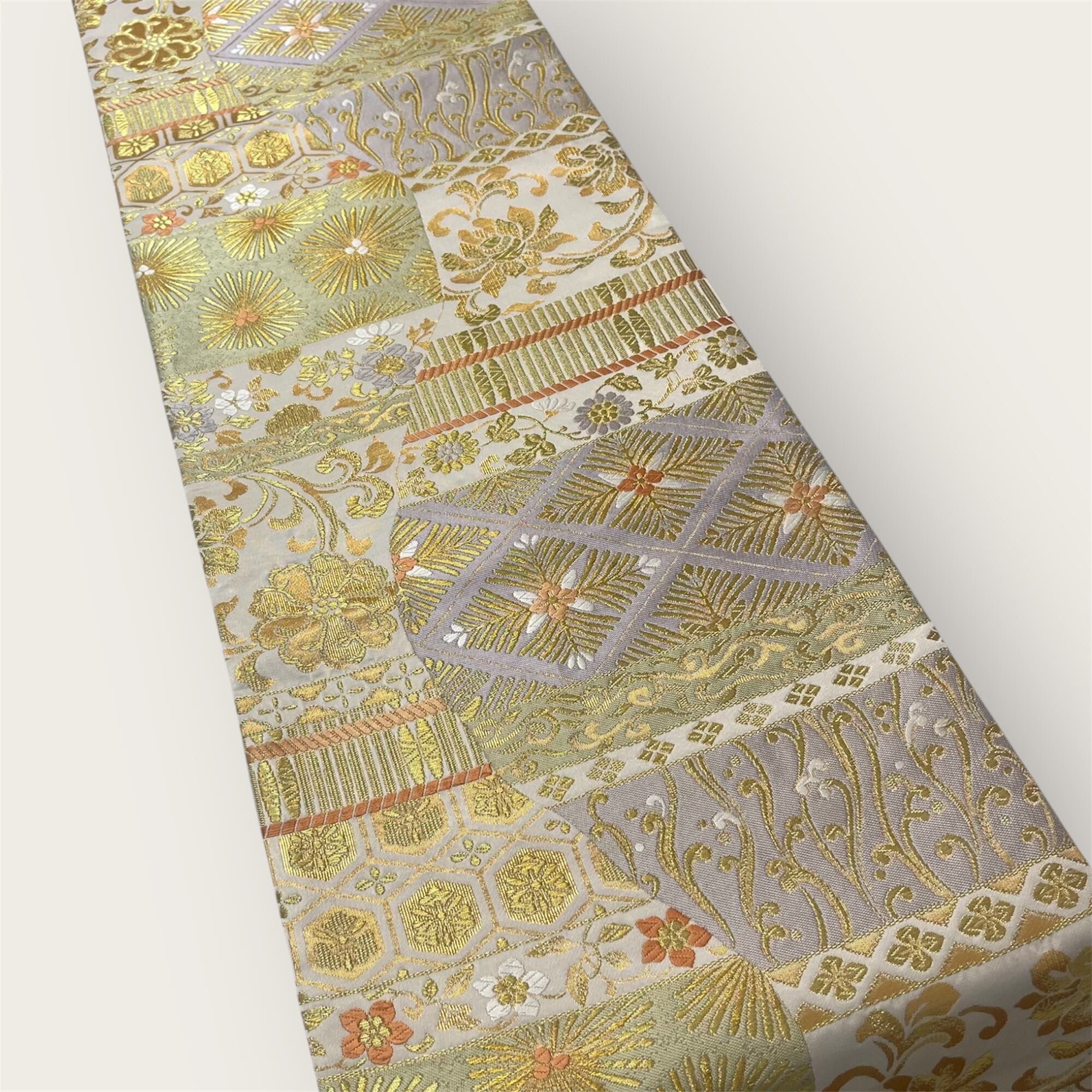 優しい生成り色と淡い金の輝きの上に、多彩な古典文様が美しく調和する上品な柄。