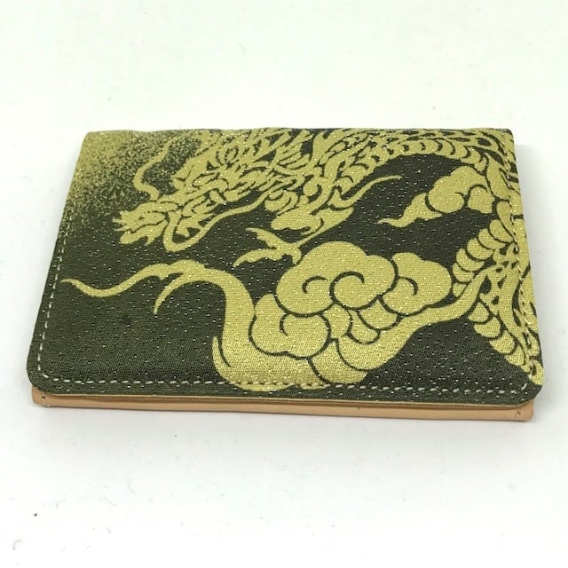西陣織の帯生地に型友禅で柄を対比させた 桔梗屋オリジナルの 龍柄に染めた名刺&定期入れを作りました。内側にも西陣織りの帯を使いヌメ革との組み合わせがモダンで尚且つ使いやすいデザインになってます。
